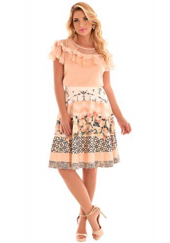 Conjunto versátil composto por saia godê confeccionada em malha premium com mix de estampas. Blusa confeccionada em crepe bubble com babados ombro a ombro em renda e pala.