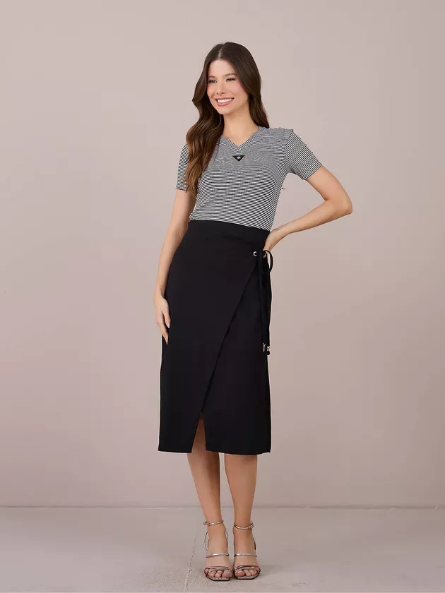 SAIA FABIANA CONFECCIONADA NO PONTO DE ROMA PREMIUM (COM ELASTANO). POSSUI ELÁSTICO NA CINTURA, COMPRIMENTO MIDI, MODELAGEM RETA, COM DETALHE DE AMARRAÇÃO TRANSPASSADO. FORRADA.